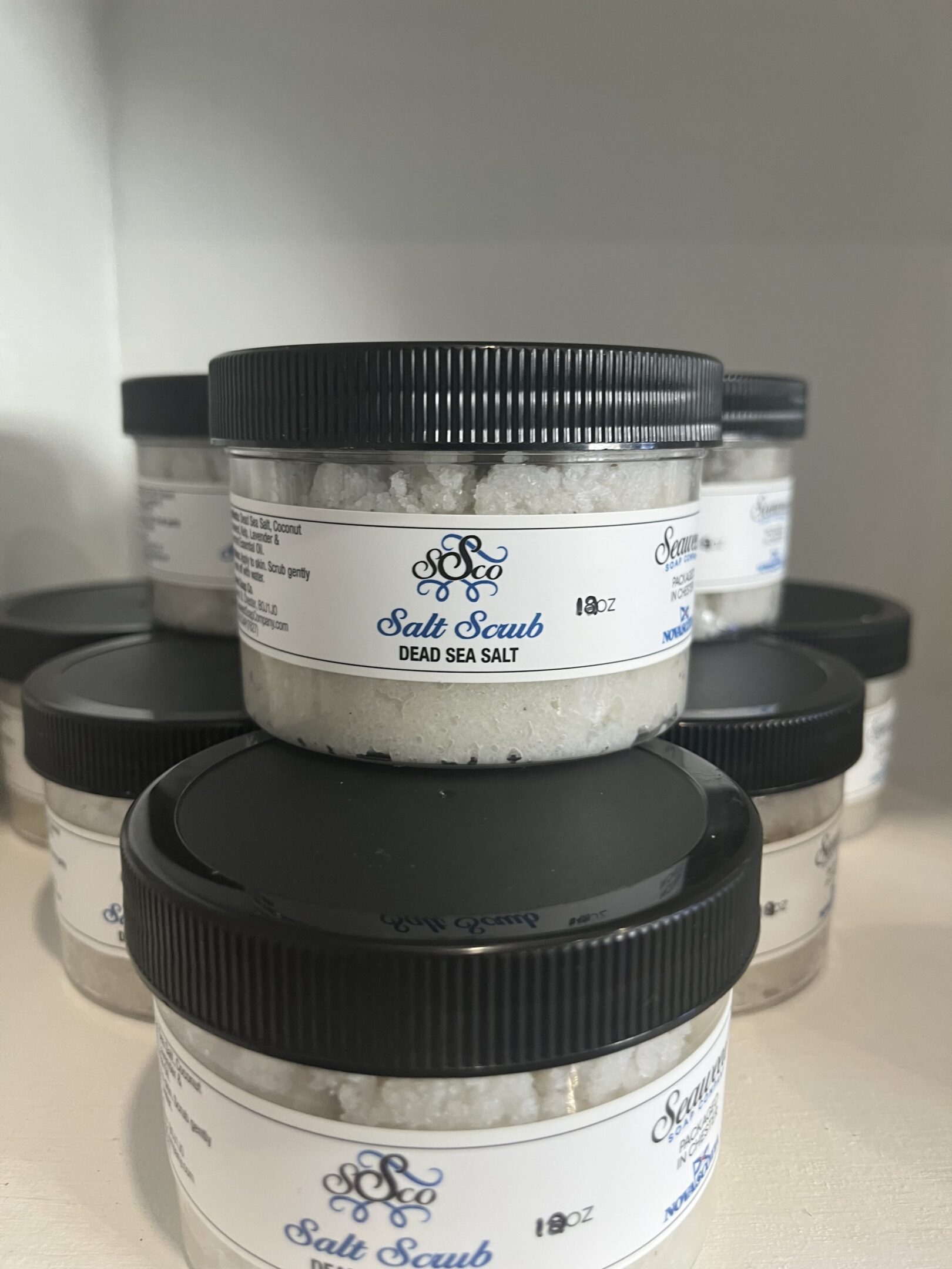 This scrub has Coconut Oil, Dead Sea Salt, Seaweed, Kelp and Irish Moss with a hint of Lavender and Peppermint essential oils.